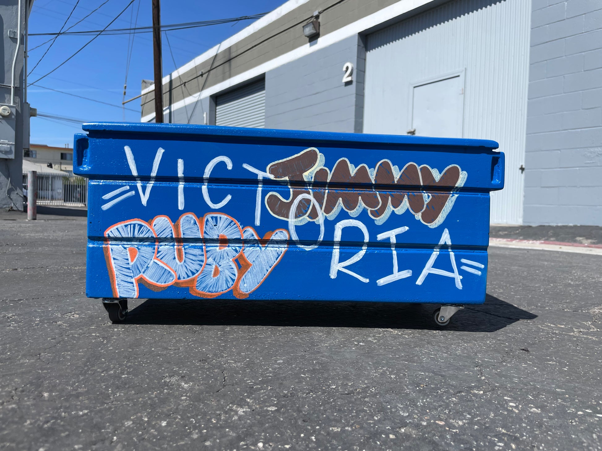 Hand Made! Each planter is slightly different with various voids and air pockets from the concrete pour. The Jumbo flower pot weights approximately 60lbs and measures approximately 20" wide, 10" deep and 10" high. The inner dimensions run about 18"x8.5", perfect for just about any plant or flower. Heavy duty casters will come attached to the bottom of the dumpster making it easy to roll around and move. This dumpster was build to replicate the real thing. Three color options; Blue, Concrete or fully customized (multicolor) by myself with your choice of names. Plants are not included.